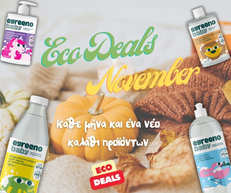 Ο Νοέμβριος έφτασε και μαζί του η πιο ολοκληρωμένη και value-for-money προσφορά της χρονιάς για νέους γονείς που θέλουν το καλύτερο για το μωρό τους και για τον πλανήτη! Το Eco Deals Νοεμβρίου είναι ένα ειδικά επιλεγμένο πακέτο με 9 πιστοποιημένα οικολογικά προϊόντα Egreeno Baby, όλα χωρίς άρωμα, με 100% φυσικά συστατικά και σχεδιασμένα αποκλειστικά για την ευαίσθητη βρεφική επιδερμίδα και το σπίτι όπου μεγαλώνει το παιδί σας.