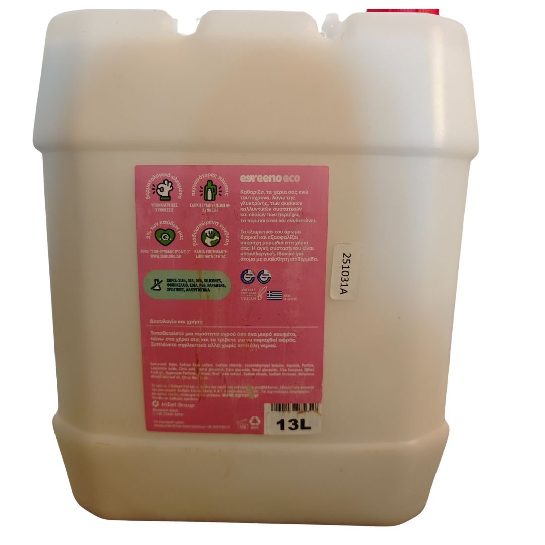 Το Οικολογικό κρεμοσάπουνο 13L Egreeno Eco είναι ένα φυσικό προϊόν με λάδι ροδιού και αιθέρια έλαια τεϊόδενδρου και μανταρινιού, που συνδυάζει την αποτελεσματική καθαριότητα με την ήπια περιποίηση της επιδερμίδας. Αυτό το κρεμοσάπουνο ξεχωρίζει χάρη στη φυσική του σύνθεση, η οποία περιλαμβάνει υψηλό ποσοστό συστατικών φυσικής προέλευσης, πάνω από 97%, προσφέροντας μια μοναδική εμπειρία χρήσης. Το εξαιρετικό του άρωμα, που προέρχεται αποκλειστικά από φυσικά αρώματα, διαρκεί για ώρες, αφήνοντας στα χέρια σας μια ευχάριστη και δροσερή μυρωδιά που θυμίζει τη φύση.